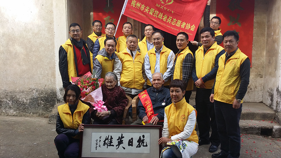 梅州市關愛抗戰(zhàn)老兵志愿者協(xié)會成立后,大力開展尋訪散居梅州山鄉(xiāng)的抗戰(zhàn)老兵,為尋訪到的每位抗戰(zhàn)老兵舉行民間簡樸又莊重的“贈章授榮”儀式、為困難老兵提供基本生活保障、為抗戰(zhàn)老兵提供日常生活照顧、為老兵過生日、重大節(jié)日慰問、生病看望看護、為抗戰(zhàn)老兵留影留聲、留手印,歸隊致以哀榮等等關愛活動,以熱心和誠心,為抗戰(zhàn)老兵送去“遲到的榮譽”和慰藉。經(jīng)協(xié)會理事會研究,決定對抗戰(zhàn)老兵進行日常關愛的同時,給幸存抗戰(zhàn)老兵每月500元的致敬金。通過發(fā)放關愛金和致敬金,使老兵每月能獲得1100元的生活保障。2014年9月至2018年5月,廣東省雁洋公益基金會發(fā)放葉劍英基金關愛金380多萬元,協(xié)會動員社會各界熱心人士和志愿者38600多人次,行程逾10萬公里,為抗戰(zhàn)老兵發(fā)放致敬金及其它慰問金等700多萬元,為抗戰(zhàn)老兵發(fā)放御寒物資一大批、保健品和日常生活用品、慰問品一大批,為住院就醫(yī)的抗戰(zhàn)老兵送上慰問金和輪值守護陪伴,累計為300多位梅州抗戰(zhàn)老兵及老兵遺孀,廣東以外800多位抗戰(zhàn)老兵及老兵遺孀送上了最真摯的關懷。